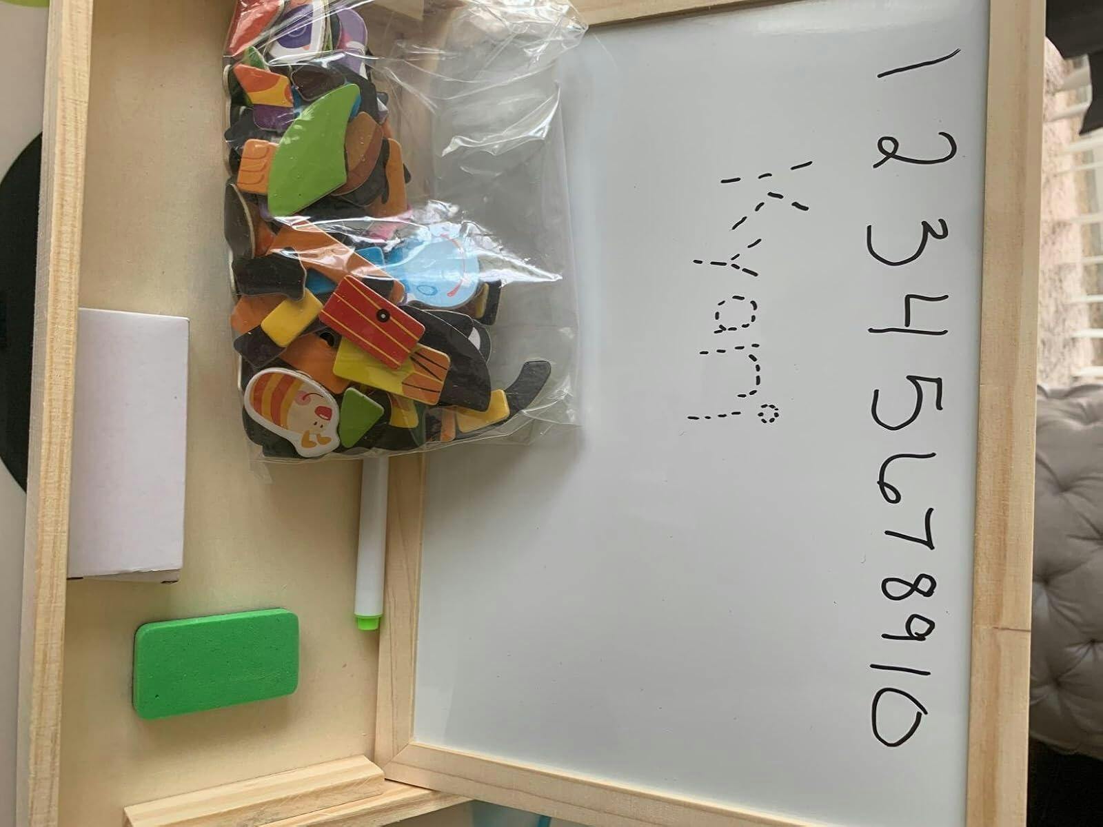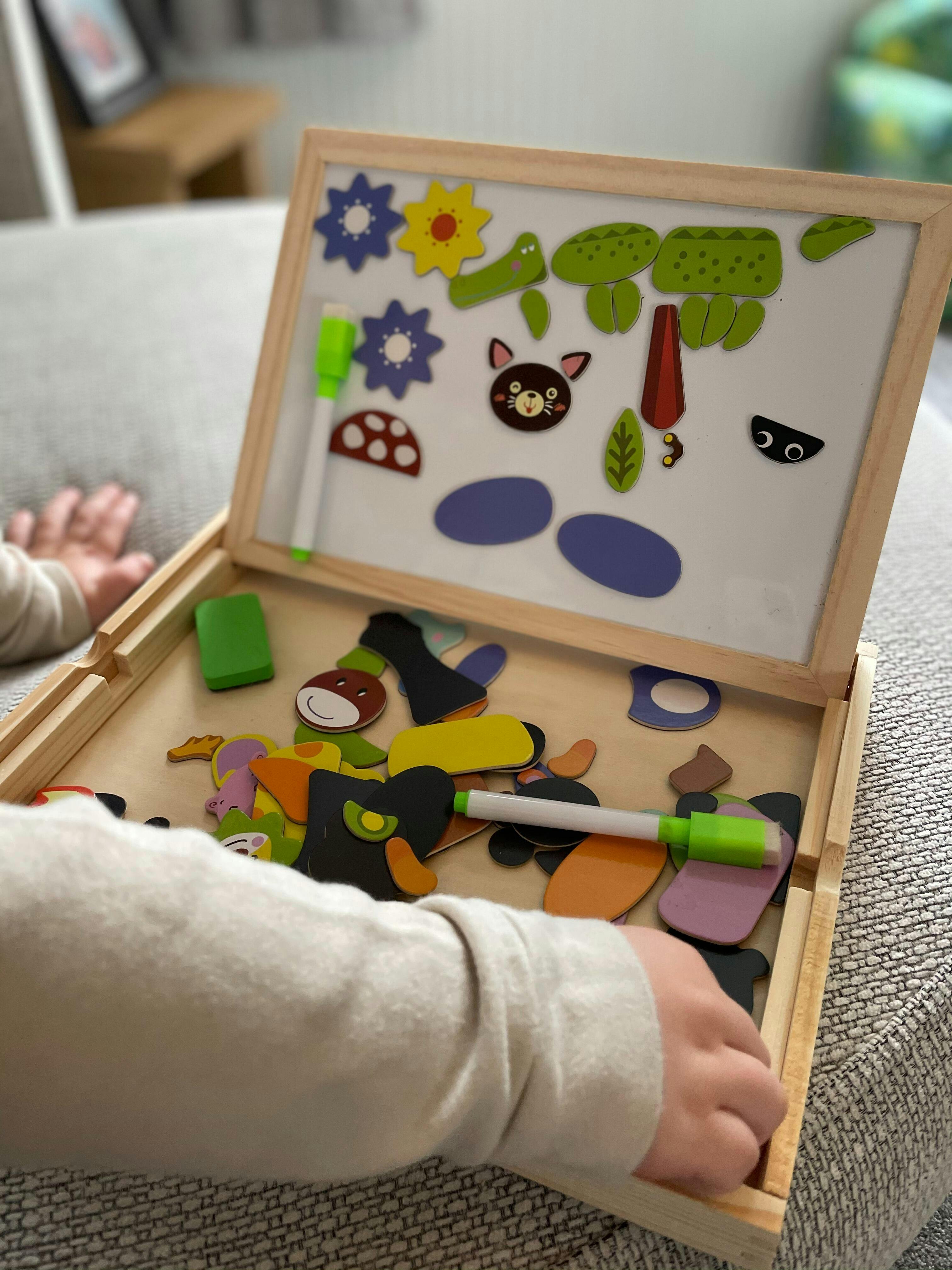 Our Montessori Creative Board comes with 100 colorful magnetic pieces, as well as a marker and 3 chalks, offering many creative possibilities for your children!